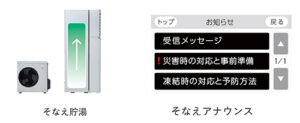 あらかじめリモコンで登録した警報がお住まいの地域で発令されると、自動で高温(65℃)沸きあげをスタートして災害前にお湯を確保する「そなえ貯湯」では、水温が15℃の場合、40℃のお湯が300L弱使用可能(貯湯量145Lの場合)です。合わせて、停電時や断水時の機器の使用方法やアドバイスをお知らせする「そなえアナウンス」など、防災対策として役立つ機能を搭載。また、停電時に非常用電源を持っていなくても、リモコンで設定した温度付近のお湯を使用できます。
