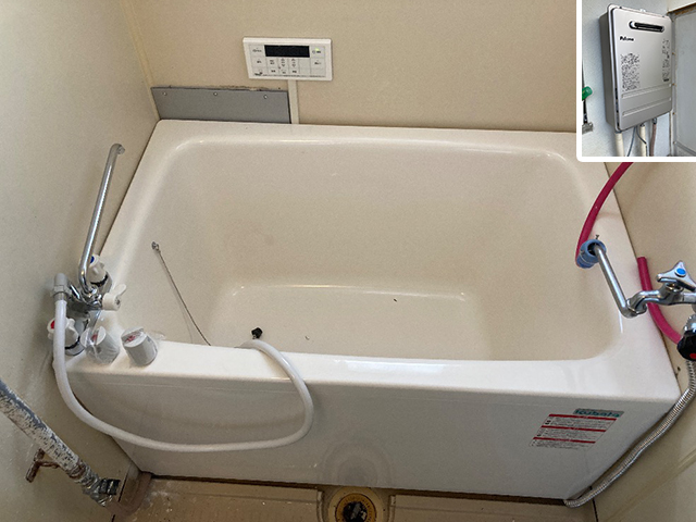奈良県桜井市の県営住宅にてお風呂の取替え(交換)工事をいたしました。リンナイシャワー付きバランス釜 RBF-A80SNと800mm浴槽から、パロマ16号給湯専用 PH-1615AW、1100mm浴槽へ交換をしました。お湯はり時に設定湯量で自動的に止まるオートストップ機能搭載の給湯専用タイプです。