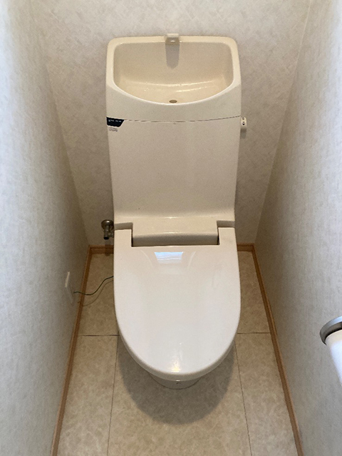 奈良県奈良市の戸建て住宅にてトイレの取替え(交換)工事をいたしました。イナックスアメージュC便器アイボリー GBC-110ST/BU8 から、アメージュ便器シャワートイレKAセット BC-Z30S+DT-Z380+CW-KA31/BN8 オフホワイトへ交換をいたしました。便器はフチがないのでサッとひと拭きおそうじがラクラクです。