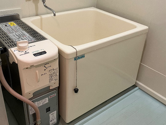 兵庫県西宮市の県営住宅にておいだき専用バランス釜から壁貫通型給湯器へ取替え(交換)工事をいたしました。リンナイバランス釜 RBF-AERSNと800mm浴槽から、壁貫通型給湯器8.2号オート RUF-HA83SA-E と1100mmFRP浴槽を設置いたしました。