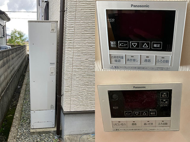 和歌山県岩出市の戸建て住宅にてエコキュート薄型タンクの取替え(交換)工事をいたしました。パナソニック370Lフルオート HE-WU37CQ から、ダイキン370Lフルオート EQA37ZFTV へ交換をいたしました。最大使用圧力330kPaのパワフル高圧なのでシャワーの勢いがよく、おふろやキッチンなど2カ所で同時にお湯を使っても快適に使用できます。年間給湯保温効率3.0、給湯省エネ2026事業補助金対象のエコキュートです。