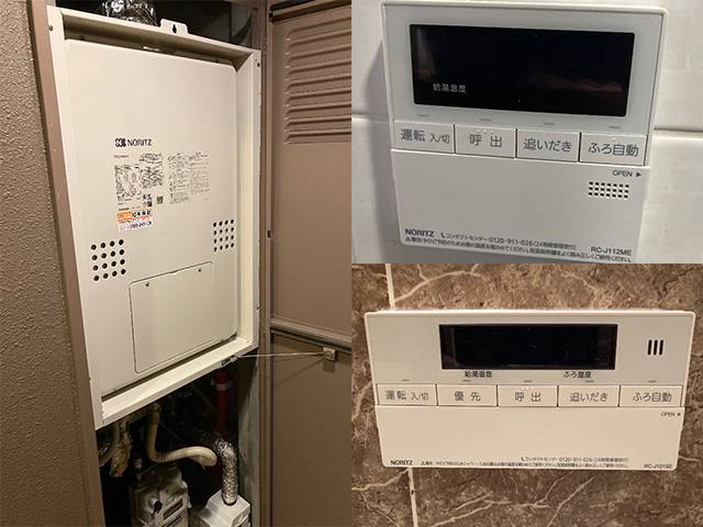 大阪府東大阪市のマンションにて上方排気型給湯暖房機の取替え(交換)工事をいたしました。大阪ガス24号オート 135-R076(RUFH-V2403SAU2-6)から、ノーリツ24号オート GTH-2454SAW3H-H へ交換をいたしました。