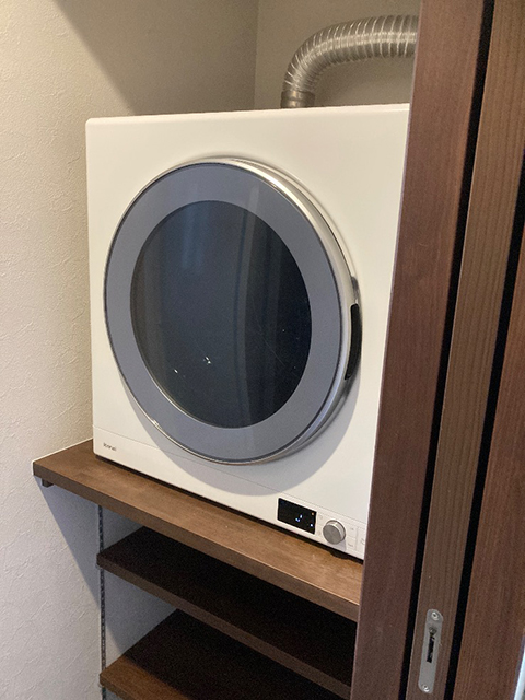 大阪府羽曳野市の戸建て住宅にてガス衣類乾燥機かんたくんの設置工事をいたしました。1階のランドリールームの造作棚へ9キロデラックス操作パネル下部タイプ RDT-93 を設置いたしました。ボックス型糸くずフィルターはドアのすぐ手前に配置されており、ワンタッチで開けられるので、お手入れがカンタンです。ドアを開けるとLEDライトが自動で点灯しドラム内の視認性を高め、洗濯物の取り出し忘れを防止します。
