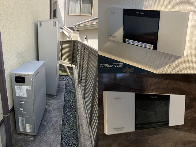 京都府京都市伏見区の戸建て住宅にてエネファームからハイブリッド給湯器へ取替え(交換)工事をいたしました。大阪ガスエネファーム 136-CF04(FCG-203-D)から、リンナイエコワン160Lマイクロバブルバスユニット内蔵ウルトラファインバブル搭載機種(RHBH-RCUM248AW2-1/RHP-R222(S)/RTU-R1602)へ交換いたしました。マイクロバブルバスユニットは浴槽のお湯に微細な気泡を発生させ白濁の湯を楽しむことができます。マイクロバブルとウルトラファインバブルのWの効果で、リラクゼーションと温泉上がりのようなうるおいをもたらします。リンナイエコワンは給湯省エネ2026補助金対象機種です。