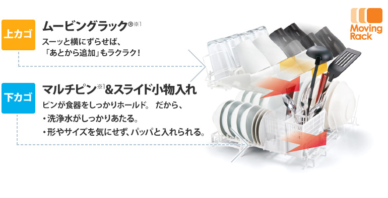 | 仕様 | ■外形寸法:幅448×奥行608×高さ751~851mm ■据付必要寸法:奥行60cm以上 ■標準使用水量:約9L(エコナビ運転の場合は約7.5L) ■収納食器容量:44点 約6人分 ■庫内容積:60L ■洗浄コース:6コース (低温・標準・強力・スピーディ・予約・乾燥) |